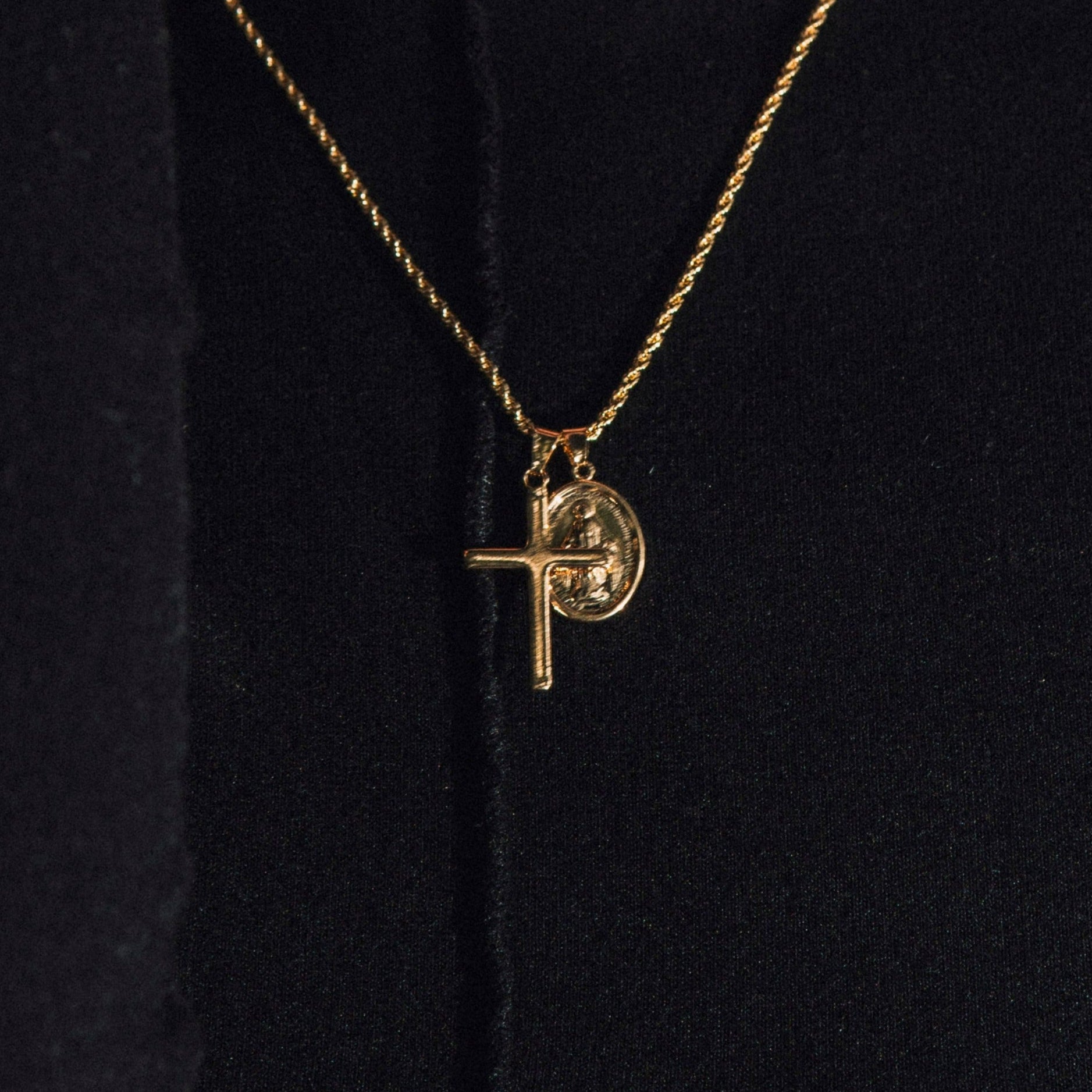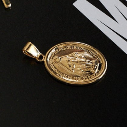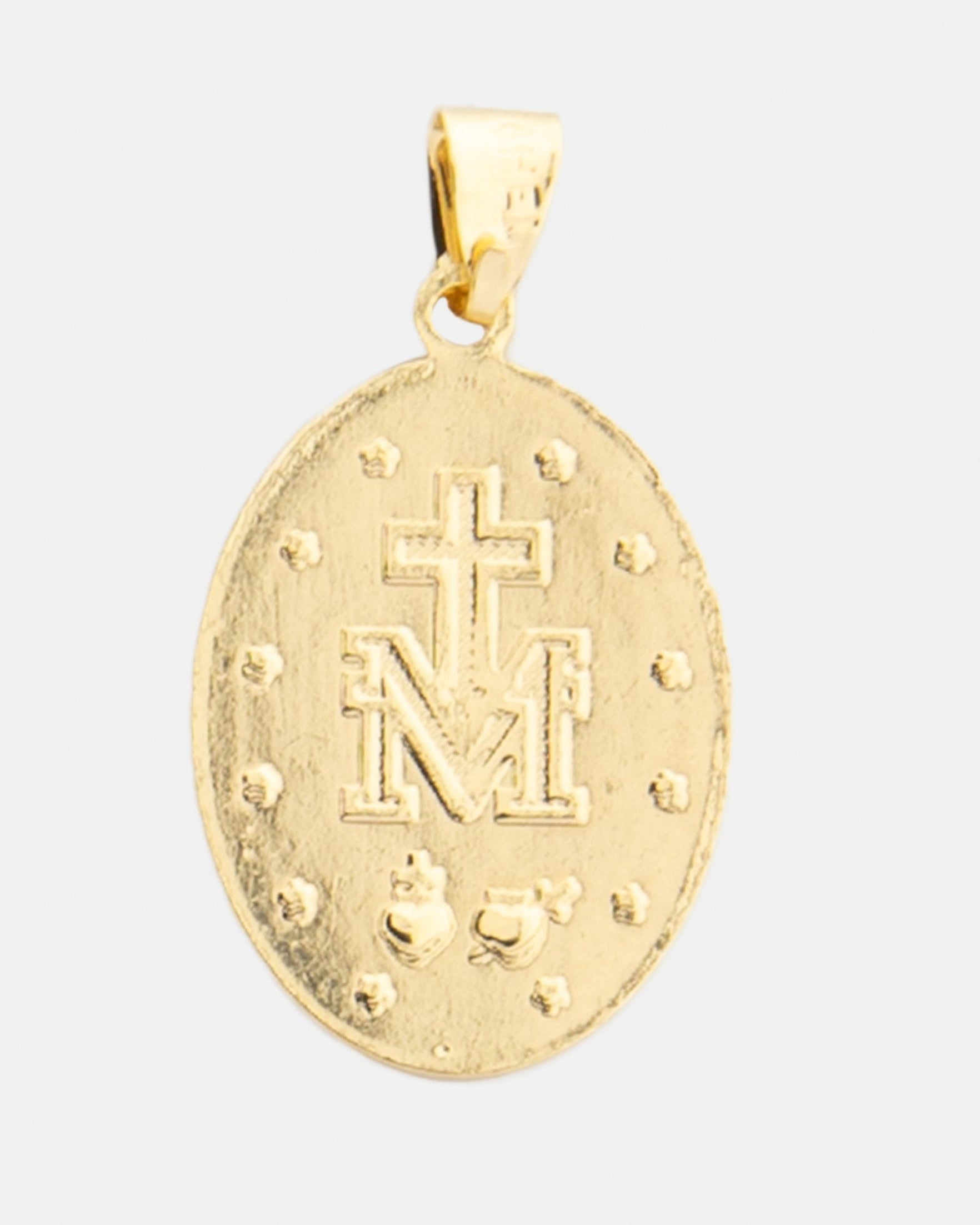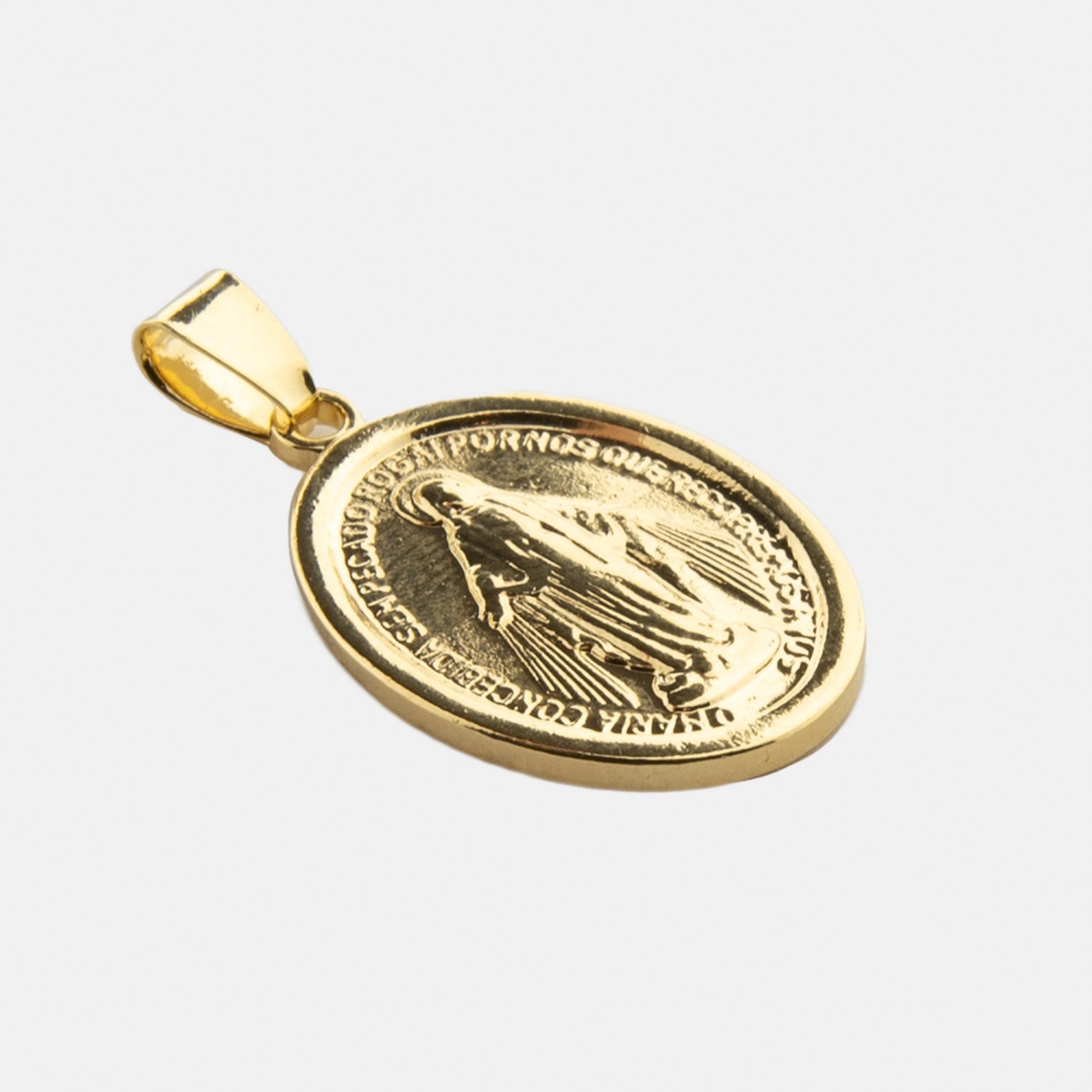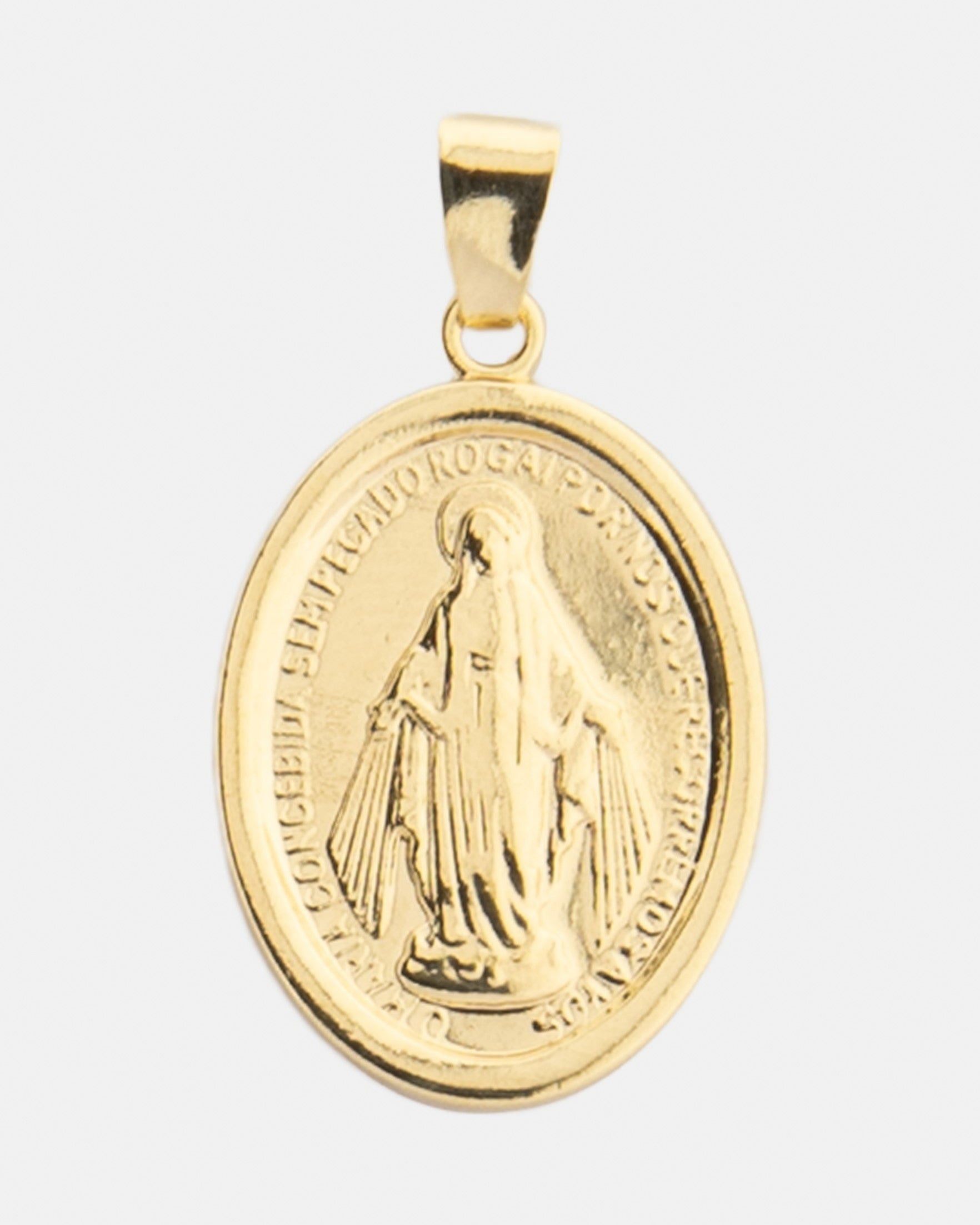 Nuestro dije María, fabricado en oro laminado de 18K, se caracteriza por su superficie lisa y el relieve de su imagen. Combínalo con cualquiera de nuestras cadenas.